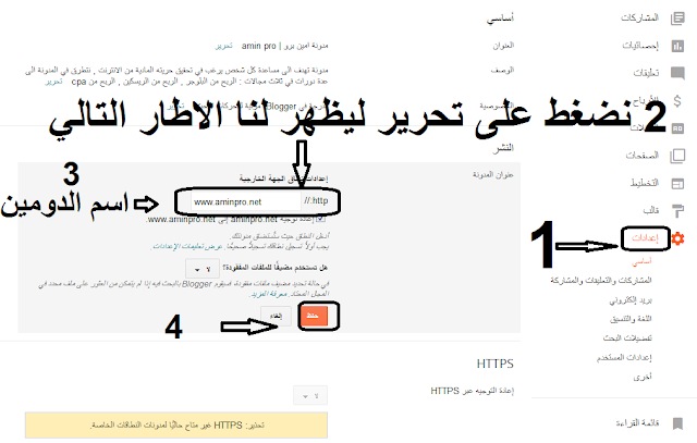 بدا على بركة الله في البداية ندخل الى لوحة تحكم المدونة التي نريد ربط الدومين بها ثم نختار اعدادات ثم في عنوان المدونة نضغط على تحرير ونكتب في الخانة الفارغة اسم ادومين الذي نريد ربطه ثم حفظ …